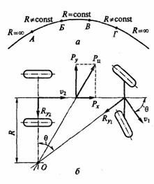 Процесс движения автомобиля на повороте включает в себя три фазы (рис. 12.3, а): вход в поворот (участок АБ), поворот (БВ) и выход из него (ВГ).