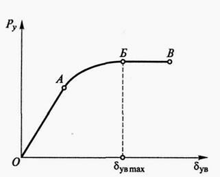 На рис. 12.5 показана зависимость угла увода колеса от приложенной к нему поперечной силы. Кривая ОАБВ включает в себя следующие характерные участки: ОА — увод колеса при отсутствии бокового скольжения шины (δув= 4...6°); АБ — увод с частичным боковым проскальзыванием шины; БВ— полное скольжение шины вбок при Ру = Рси (δув = 12... 15°).