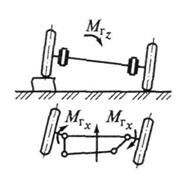 Поворот колес вокруг шкворней вызывает возникновение другого гироскопического момента Mrz, который действует в вертикальной плоскости и стремится увеличить перекос моста и наклон колес.