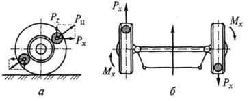 а — силы, действующие на неуравновешенные колеса; б — схема возникновения поворачивающего момента
