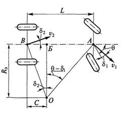 О — центр поворота; А, В — центры осей передних и задних колес; С — расстояние между центром В оси задних колес и точкой Б — проекцией центра поворота на продольную ось автомобиля; vb v2 — векторы скоростей передних и задних колес