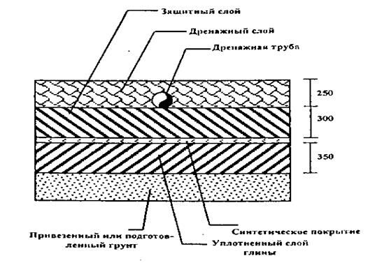 Определенный интерес представляет конструкция основания (подушки), на которое укладывается руда для выщелачивания (рис. 12.2). Площадка для размещения кучи предварительно очищалась от растительного слоя, на нее наносился слой уплотненной глины.