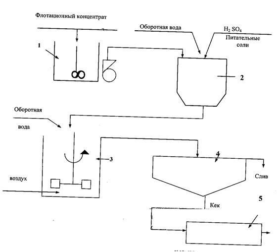 1 - приемный чан для концентратов, 2 - смеситель для подготовки пульпы, 3 - биореактор объемом 580 м3, 4- сгуститель, 5- автоклав
