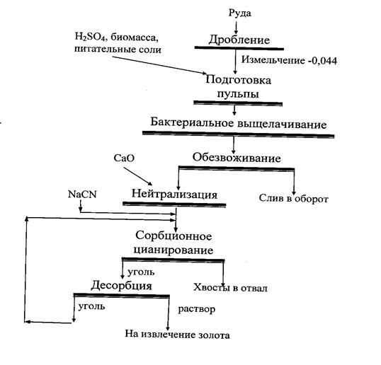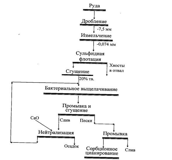 Интересен опыт промышленной установки бактериального выщелачивания на Sao-Bento (Бразилия), для которой фирмой General Min. Metals and Minerals разработана комбинированная технология вскрытия золотосодержащих сульфидов, включающая пред-варительное бактериальное выщелачивание золотомышьяковых концентратов и последующее автоклавное доокисление его (рис.15.3).