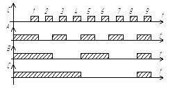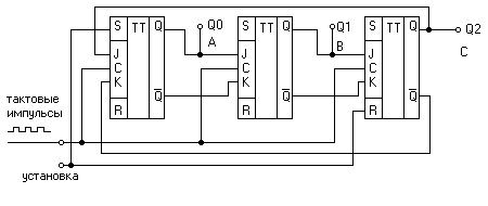 При h=3 –счётчик будет иметь 2h=8 состояний, что достаточно. Будем проектировать счётчик на 3-х JK-триггерах, а их выходные сигналы будут выходными сигналами счётчика.
