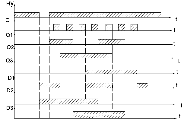 Десятичные коды последовательности выходных сигналов Q равны: 1, 3, 2, 6, 7, 5, 4, 0.