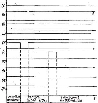 2. Подачей сигнала записи РE= 0 (ключ S2 кратковременно переведите из положения 3 в положение 4) осуществите запись информации. На временной диаграмме отобразите изменение выходных разрядов Q3 - Q0 . Отметьте, по какому фронту: от I к 0 или от 0 к I сигнала РЕ происходит занесение информации в счетчик.
