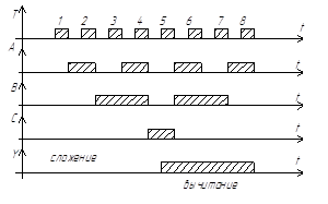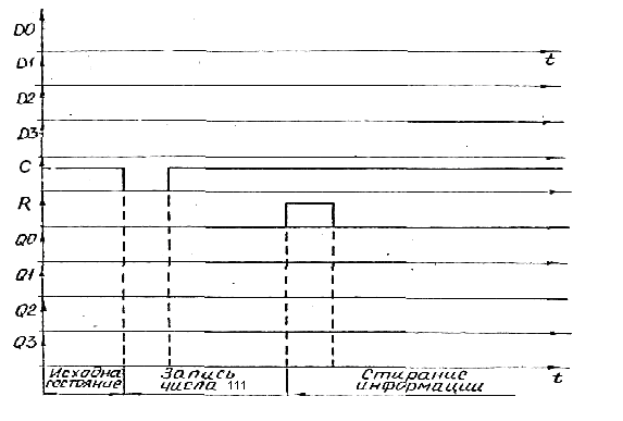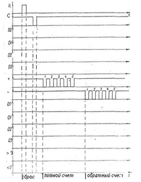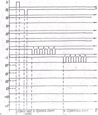 1. Для проведения опыта переключателем ГП2 введите обратную связь, обнуляющую содержимое счётчика при наличии на его выходе сигнала 01012(510) (переключатель ГП2 в положение 13). Подайте на входы счётчика число 00112(310), переведя ГП1 в положение 9. Выполните последовательно действия, описанные в разделе Б: сброс счётчика, запись числа 310, прямой счёт пяти импульсов, обратный счёт пяти импульсов. Результаты исследований отобразите на временных диаграммах, аналогичных рис.8.