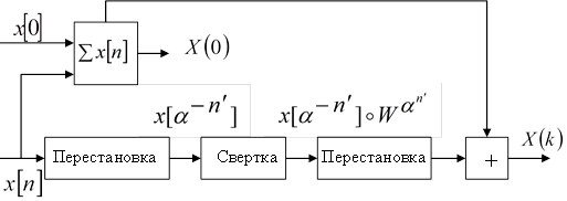 - Так, если длина равна степени двойки, то возможны быстрые алгоритмы преобразований, структура которых аналогично БПФ с прореживанием по частоте и по времени за исключением того, что операционный умножитель на поворачивающий множитель заменяется операцией умножения на степень двойки, то есть сдвигами: