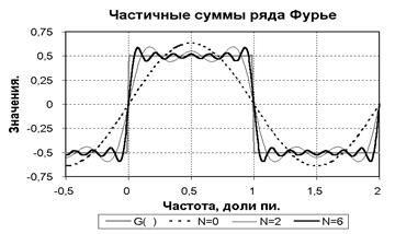 - крутизна перепадов "размывается", т.к. она не может быть больше, чем крутизна (в нулевой точке) последней сохраненной гармоники ряда (3.1.2);