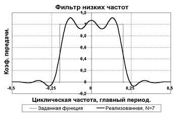 Последствия для практики. При расчетах фильтров и усечении размеров их операторов явление Гиббса является весьма нежелательным, т.к. приводит к искажению формы передаточных характеристик фильтров. В качестве примера рассмотрим явление Гиббса применительно к фильтру низких частот.
