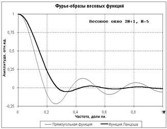 Как видно на рисунке, частотная характеристика весовой функции Ланцоша по сравнению с П-образной функцией имеет почти в 4 раза меньшую амплитуду осцилляций, но при этом ширина главного максимума увеличилась примерно на 1/4. Отметим, однако, что если амплитуда осцилляций (в единицах амплитуды главного максимума) определяется выбранным типом весовой функции, то ширина главного максимума, которой определяется ширина переходной зоны (вместо скачка функции) зависит от размеров весового окна и соответственно может изменяться под поставленные условия (уменьшаться увеличением размера 2N+1 весового окна).