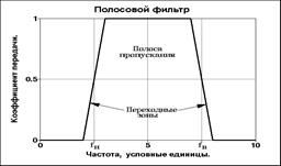 Идеальным полосовым фильтром называется фильтр, имеющий единичную амплитудно-частотную характеристику в полосе от определенной нижней частоты wн до определенной верхней частоты wв и нулевой коэффициент передачи за пределами этой полосы (для цифровых фильтров - в главном частотном диапазоне).