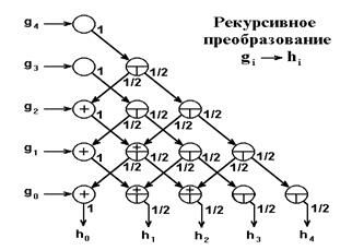 3. Применяя рекурсивное преобразование, получаем коэффициенты ФНЧ: hn= {(98, 70, 20, -5, -5, -1)/256}.