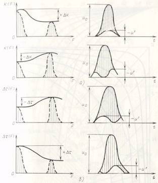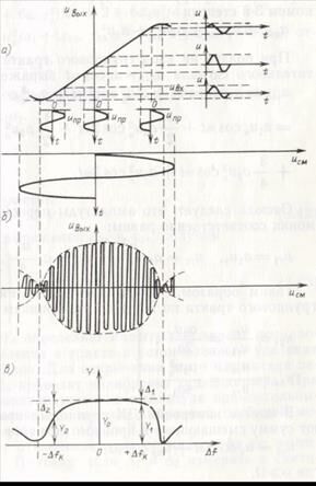. При этом напряжение на выходе тракта будет зависеть от закона изменения крутизны АХ. Если на выходе группового тракта с помощью фильтра выделить напряжение пробного сигнала и подать его на вход вертикального отклонения луча осциллографа, а на вход горизонтального отклонения – напряжение смещения, то на экране получим пробный сигнала (рисунок 11.2б), огибающая которого (рисунок 11.2в) пропорциональна крутизне АХ. Для определения относительного изменения крутизны необходимо измерить на экране осциллографа