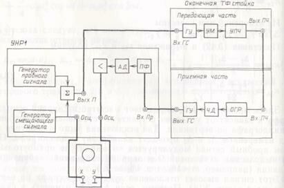 Суммарный сигнал по кабельной перемычке подают от гнезд ВЫХ П УНР 1 ко входу группового сигнала ВХ ГС оконечной телефонной стойки, передающая часть которой содержит следующие элементы: групповой усилитель ГУ, частотный модулятор ЧМ и усилитель промежуточной частоты УПЧ. При работе оконечной ТФ стойки в режиме «на себя» гнездо ВЫХ ПЧ ее передающей части соединено с гнездом ВХ ПЧ приемной части, содержащей ограничитель амплитуды ОГР, частотный детектор ЧД и групповой усилитель ГУ. Далее с выхода гнезда ВЫХ ГС сигнал подается на полосовой фильтр ПФ, амплитудный детектор АД и усилитель, содержащиеся в приемной части прибора УНР 1.