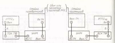 Измерение мощности шумов на выходе ТФ каналов РРЛ. Указанные измерения проводятся на РРС ежемесячно с помощью прибора УНР 1 и измерителя переходных помех ИПП 2. Обычно измеряют псофометрическую мощность шума одного или нескольких пролетов РРЛ. При этом оценивают тепловые шумы приемопередающей аппаратуры, а также нелинейные переходные шумы, вызванные неравномерностью ХГВЗ ВЧ тракта и отражениями сигналов в АФТ. Структурная схема измерений приведена рисунке 11.5.