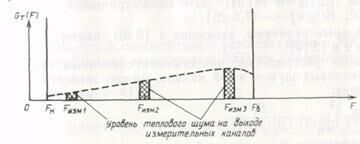 В отсутствие загрузки линии многоканальным ТФ сообщением при выключенной передающей части ИПП 2 приемная часть ИПП2 измерит уровень тепловых шумов в измерительных каналах. Спектр сигнала в точке Б в этом случае будет меть вид, показанный на рисунке 11.8. Таким образом, имеется возможность отдельного измерения тепловых и нелинейных переходных шумов на выходе ТФ канала.