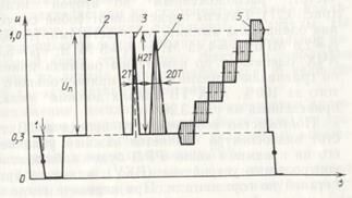 Измерение качества телевизионных каналов с помощью сигналов испытательных строк. Для контроля качества работы ТВ каналов во время передачи в сигнал изображения подмешиваются специальные контрольные сигналы, которые передаются по РРЛ одновременно с ТВ сигналами. Контрольные сигналы вводятся в строки с 17 по 22 кадрового гасящего импульса, которые расположены на экране кинескопа выше изображения. Эти строки называются испытательными. Используют две испытательные строки: первая (рисунок 9) содержит четыре контрольных сигнала: прямоугольный импульс «белого» - 2, синусквадратичный импульс 2Т – 3, испытательный импульс 20Т – 4 и ступенчатый сигнал – 5 с