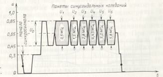 Контроль АЧХ тракта осуществляют по контрольным пакетам частот, расположенным во второй испытательной строке (рисунок 11.10). Пакеты представляют собой синусоидальные колебания одинаковой амплитуды с частотами: 0,5 МГц; 1,5 МГц, 2,8 МГц; 4,43 МГц; 5 МГц; 5,8 МГц. Искажения АЧХ оценивают по изменению размаха пакетов частот (