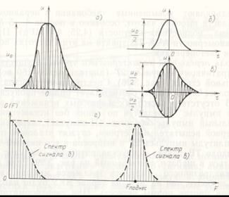 С помощью испытательного импульса 20Т имитируются сигналы яркости и цветности. Этот испытательный импульс (рисунок 11.13), и состоит из двух сигналов: синусквадратичного длительностью 20Т (рисунок 11.13б)—этот импульс имитирует сигнал яркости (его частотный спектр показан на рисунке 11.13г) и поднесущей цветности модулированной по амплитуде импульсом 20Т (рисунок 11.13в). Спектр этого сигнала показан на рисунке 11.13г.