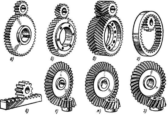 - прямозубые (см. рис. 3.4, а, г, д, е), косозубые (см. рис. 3.4, 6, ж);