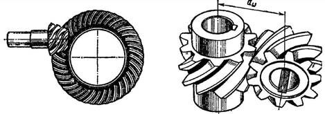 Чаще применяют конические колеса с круговыми зубьями, которые обладают рядом преимуществ: при одинаковых габаритных размерах имеют более высокую несущую способность; при повышенных окружных скоростях (до 11 м/с при нешлифованных зубьях и до 35 м/с при шлифованных) работают плавно и бесшумно вследствие большого перекрытия зубьев в зацеплении; сохраняют удовлетворительное пятно контакта при значительных деформациях деталей передачи.
