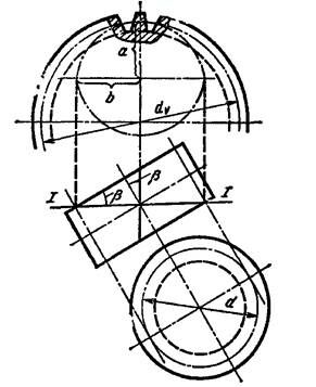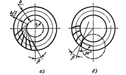 Тангенциальные зубья (рис. 3.24, а) направлены по касательной к некоторой воображаемой окружности радиусом е и составляют с образующей конуса угол р. Круговой зуб (рис. 3.24, б) располагается по дуге окружности, по которой движется инструмент при нарезании зубьев. Угол наклона кругового зуба переменный. Величина угла β ≤ 30º — для колес с тангенциальным зубом и βm = 35º — для колес с круговым зубом.
