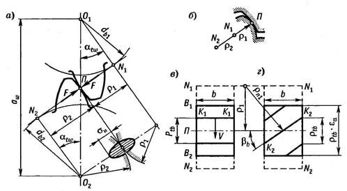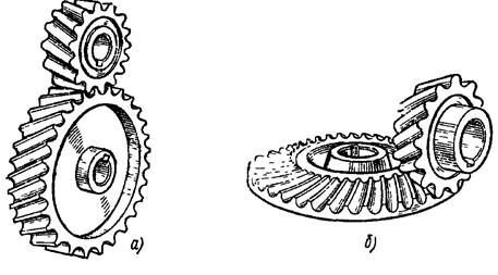 В современном машиностроении широко применяется эвольвентное зацепление. Циклоидальное зацепление в настоящее время сохранилось в приборах и часах. М. Л. Новиков предложил принципиально новое зацепление, в котором боковой профиль зуба очерчен дугами окружностей. Это зацепление (рис. 3.7) возможно лишь при косых зубьях (цилиндрическая передача–рис. 3.7, а, коническая – рис. 3.7, б). Благодаря высокой несущей способности зацепление М. Л. Новикова весьма перспективно.