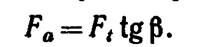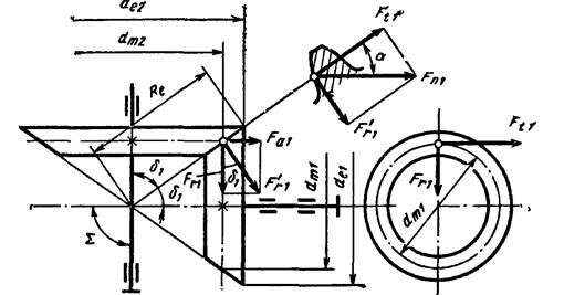 Силы в зацеплении прямозубой конической передачи. В зацеплении конической передачи действуют силы: окружная Ft, радиальная Fr и осевая Fa. Зависимости между этими силами установим с помощью рис. 3.26, где изображенные силы приложены к шестерне.