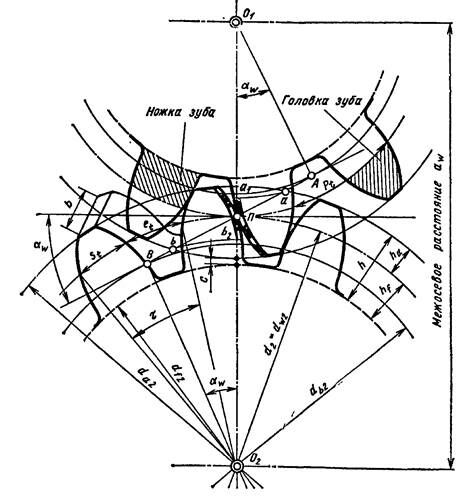 Начальными называют концентрические окружности, проходящие через полюс П, которые в процессе зацепления перекатываются одна по другой без скольжения. При изменении в допустимых пределах межосевого расстояния aω меняются и диаметры начальных окружностей шестерни и колеса, Следовательно, у пары зубчатых колес может быть множество начальных окружностей, которые определяются в результате монтажа. У отдельно взятого колеса начальной окружности не существует.