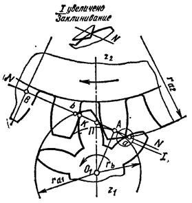 Понятие об интерференции. Увеличение активных профилей зубьев возможно вследствие увеличения диаметров окружностей вершин. Однако если окружность вершин одного из зубчатых колес будет пересекать линию зацепления за предельными точками А или В, то произойдет явление интерференции зубьев, при ко тором профиль головки зуба одного колеса накладывается на профиль ножки зуба второго колеса за пределами линии зацепления (рис. 3.9). Произойдет заклинивание колес.