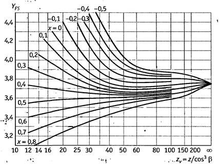 коэффициенты формы зуба эквивалентных колес (определяются по zv1 и zv2 при помощи таблиц).