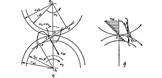 Скольжение и трение в зацеплении. В точке контакта С (рис. 3.10, а) наблюдается перекатывание и скольжение зубьев. Скорость скольжения vск можно определить из выражения vск = e (ω1 ± ω2), из которого видно, что скорость скольжения в произвольной точке касания двух сопряженных профилей пропорциональна расстоянию е этой тонки от полюса зацепления. В полюсе она равна нулю, а при перекоде через полюс меняется знак.