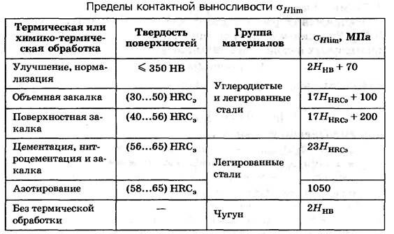 Предел выносливости σHlim, соответствующий базовому числу циклов NGH , зависит от средней твердости поверхности зуба. Коэффициент безопасности SH =1,1 – для зубчатых колес с однородной структурой (улучшение, объемная закалка), SH =1,2 – для колес с поверхностным упрочнением. Коэффициент долговечности для контактных напряжений (при m = 6)