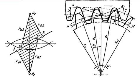 Активная линия зацепления. Как указывалось выше, линией зацепления зубчатой передачи является отрезок АВ, который представляет траекторию общей точки контакта двух сопряженных зубьев за период их зацепления (см. рис. 3.8). При этом отрезок АВ определяет предельную длину линии зацепления. При внешнем зацеплении эволь-вентные профили являются сопряженными только в пределах отрезка АВ линии зацепления, ограниченного точками касания с основными окружностями (точки A и В получены путем восстановления перпендикуляров к производящей прямой соответственно из центров О1 и O2). Таким образом, за пределами линии зацепления нарушается основная теорема зацепления.