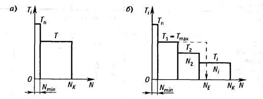 где σFlim определяют по табличным значениям; YNmax = 2,5...4; KSt – коэффициент, учитывающий повышение предельных напряжений при однократном ударе (KSt = 1,2 при m = 9, KSt = 1,3 при m = 6); SFSt = 1,75 – коэффициент безопасности. Закон нагружения передачи задают графиком в координатах нагрузка – число циклов нагружения или время работы. На рис. 3.22, а показан график или циклограмма при работе с постоянной внешней нагрузкой, на рис. 3.22, б– с перемен ной внешней нагрузкой. В качестве нагрузки принят вращающий момент Тп. При переменном режиме нагрузка периодически или случайным образом меняется во времени. Циклограмму составляют путем упорядочения нагрузок, начиная с максимальной.