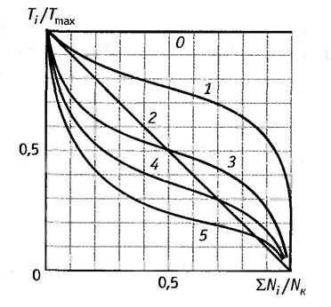 Типовые режимы нагружения (рис. 3.23: 0 – постоянный; 1 – тяжелый; 2 – средний равновероятный; 3 – средний нормальный; 4 – легкий; 5 – особо легкий) построены в относительных координатах Tl/Tmax и Nt/NK (Tmax – момент, принятый при расчете на сопротивление усталости). Ступенчатые циклограммы заменены кривыми линиями. В приложении к ГОСТу 21354-87 принято 6 типовых режимов нагружения.