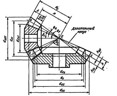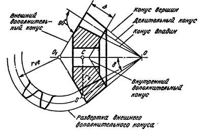 По длине зуба модуль, а соответственно и высота переменны. Для удобства измерения конических колес их размеры принято определять по внешнему торцу зуба, образованному внешним дополнительным конусом.