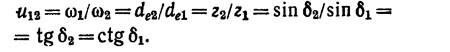 Передаточное отношение. Углы делительных (начальных) конусов δ1 и δ2 связаны с передаточным отношением так же, как и у конических фрикционных передач. При ∑ = 90° можно записать