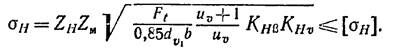 где Ft — окружная сила, H; bw — ширина венца, мм; ZH = 1,76 cos βm; ZH =275 МПа1/2; КHβ и KHv — коэффициенты нагрузки (см. табл. 4.9 и 4.10).