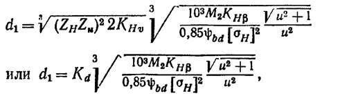 Проектировочный расчет. Заменив в формуле (4.39) значения Ft = 2*103M2/d1u, b = ψbdd1 и решая полученное выражение относительно d1, запишем