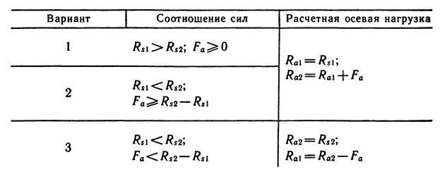 3. Для шариковых радиально-упорных и роликовых конических подшипников определяют для обеих опор осевые составляющие Rs от радиальных сил Rr [формулы (24.4) и (24.5) ], а затем по формулам табл. 24.3 вычисляют расчетные осевые силы Ra.
