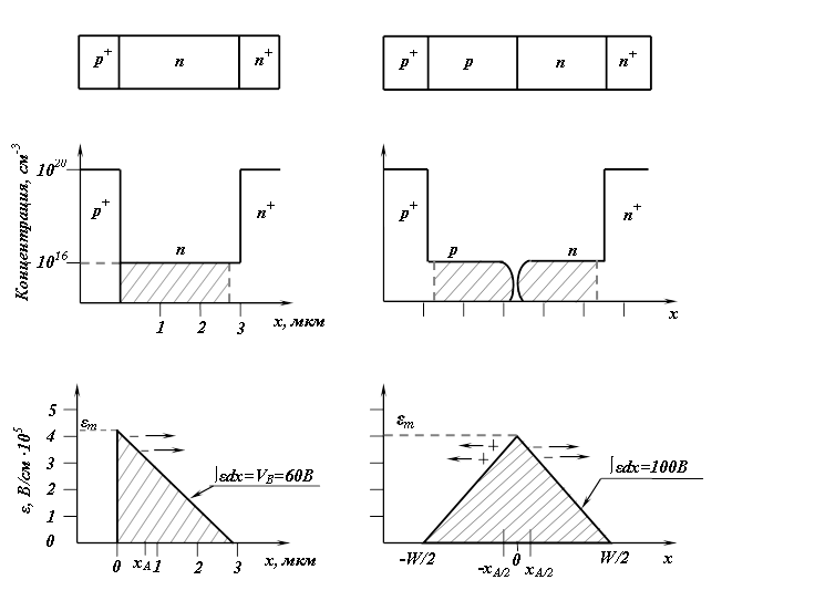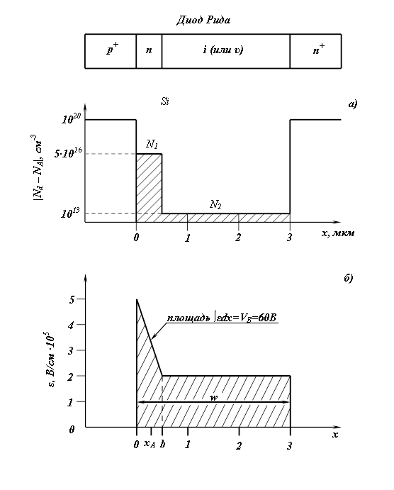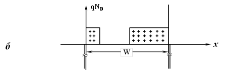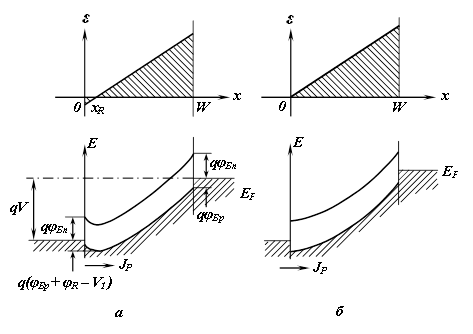 При использовании дискретного диода Шоттки в СВЧ диапазоне необходимо выдержать при его изготовлении некоторые условия, которые предотвратят инжекции неосновных носителей в высокоомную область контакта (т.е. дырок в полупроводник). Для этого необходимо, чтобы разность работ выхода из полупроводника и металла не приводила к образованию слоя с инверсным типом электропроводности (слой полупроводника р-типа). В противном случае из приконтактного слоя р-типа инжектировались бы дырки в n-полупроводнике На контакте рn можно записать как (рисунок 3.27, а)
