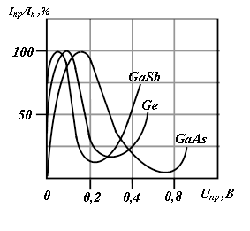Промышленность выпускает туннельные диоды из арсенида галлия и из германия. Их вольтамперные характеристики показаны на рисунке 3.4. Из рисунка видно, что, чем больше ширина запрещенной зоны исходного полупроводника, тем при больших напряжениях наблюдается отрицательное дифференциальное сопротивление.