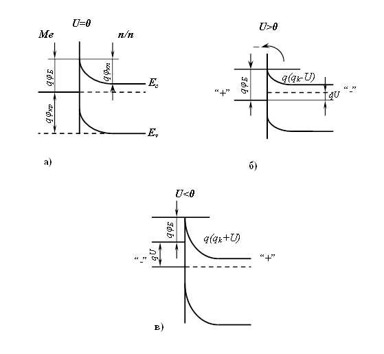 Рисунок 3.22 - Энергетические зонные диаграммы выпрямляющего контакта металл - полупроводник n – типа при тепловом равновесии U = 0 (а) при прямом смещении (б) и при обратном смещении (в)