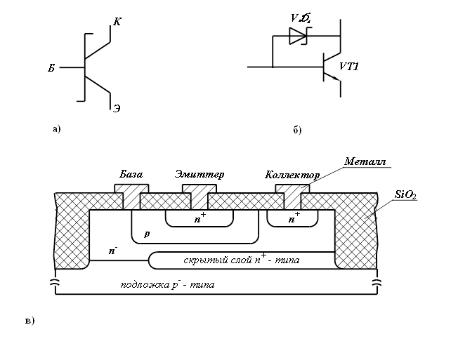Рисунок 3.23 - Обозначение транзистора Шоттки в системе ЕСКД (а), физическая эквивалентная схема транзистора Шоттки (б) и структура транзистора Шоттки (в)