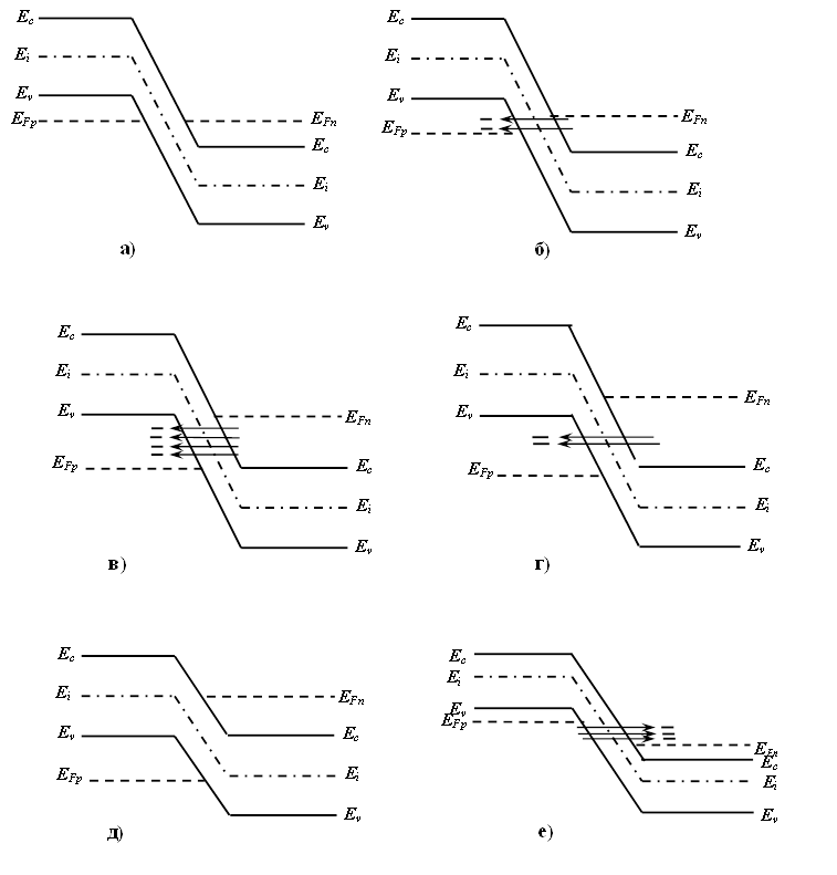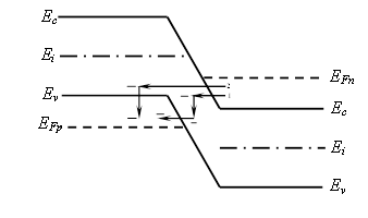 На рисунке 3.2 показаны пути, которые могут проходить электроны, туннелирующие через ловушечные состояния из зоны проводимости n – области в валентную зону р – области.