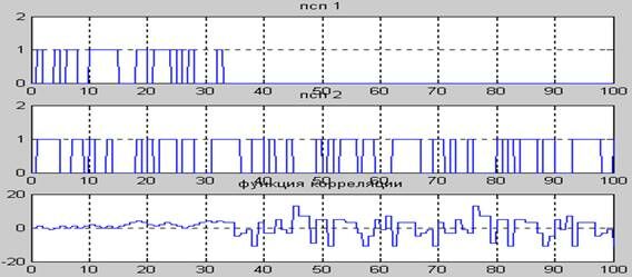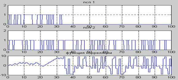 На осциллограммах показан один период одной ПСП и три периода другой. Вычисление функций корреляции начинается после завершения формирования ПСП, т.е. на втором и третьем периодах ПСП.