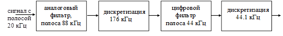 Наложение можно устранить, установив, до дискретизации, аналоговый фильтр с полосой пропускания fm и крутым спадом АЧХ. Такие фильтры дороги. Применяют «выборку с запасом» (oversampling): после аналогового фильтра сигнал дискретизируют с высокой частотой порядка 8fm , при которой эффект наложения практически отсутствует, а затем пропускают через цифровой фильтр с крутым спадом АЧХ. Например, в аудиосистеме используют следующую схему: